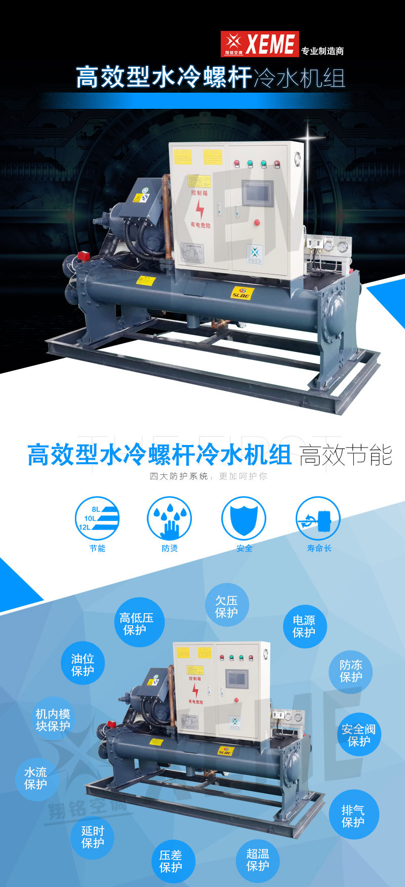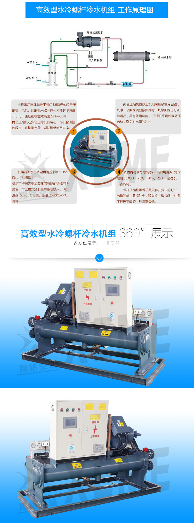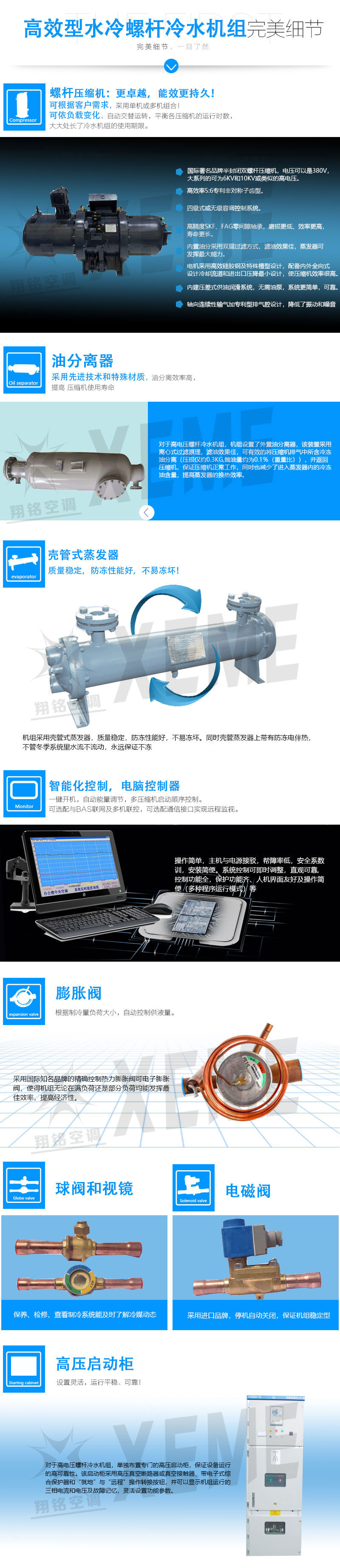江蘇翔銘空調設備有限公司——螺桿式冷水機組是以各種形式的螺桿壓縮機為主機的冷水機組。它是由螺桿式制冷壓縮機、冷凝器、蒸發(fā)器、熱力膨脹閥、油分離器以及自控元件和儀表等組成的組裝式制冷裝置。目前,螺桿式冷水機組在我國制冷空調領域內得到越來越廣泛的應用,其典型制冷量范圍為700~1000kW。