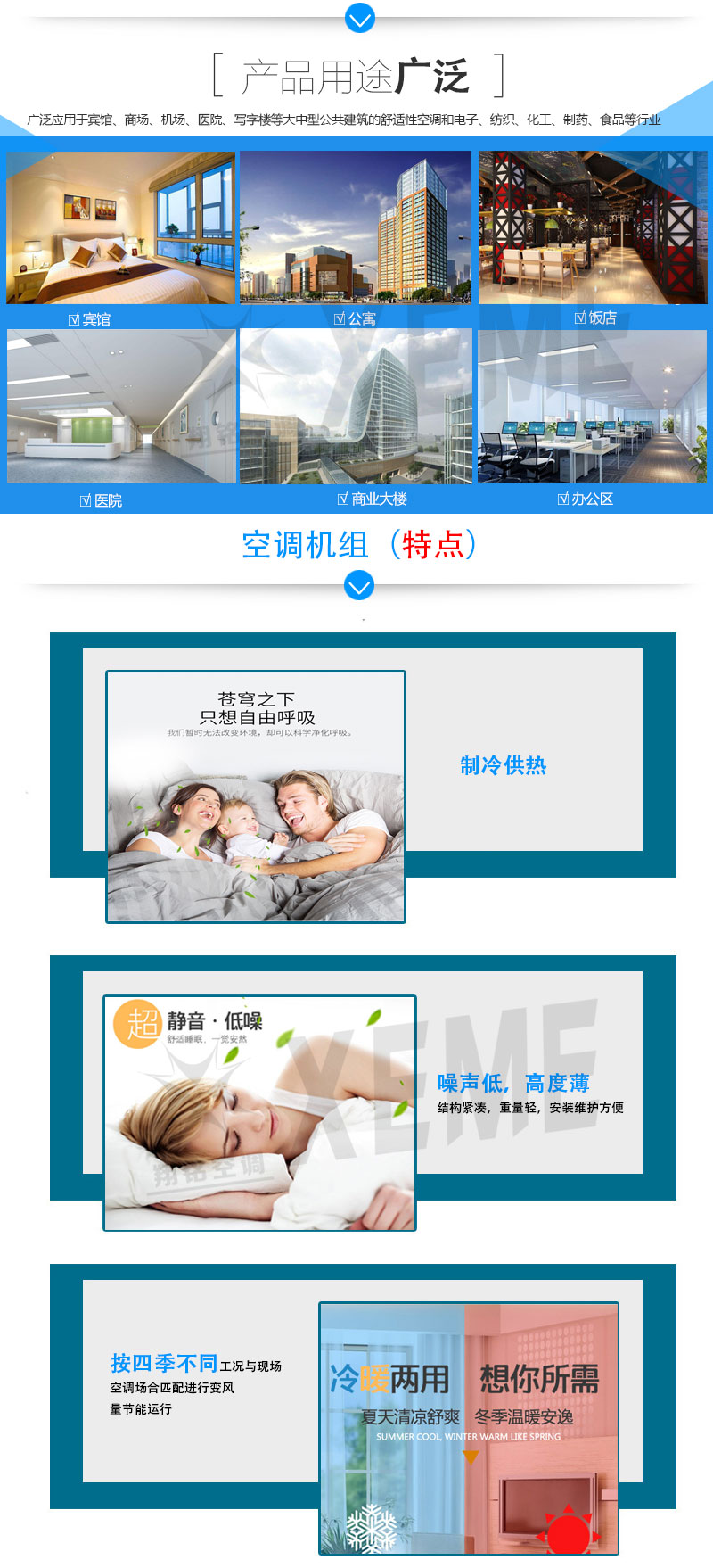 江蘇翔銘空調設備有限公司——組合式潔凈空調機組風量從3500m3/h至200000m3/h計30種規格共12種功能段供用戶自由選擇組合。主要適用于各種潔凈廠房的空氣凈化系統,如工業電子廠、精密機械制造廠、紡織車間、汽車噴涂車間、GMP制藥廠、化妝品、食品廠、純水車間、醫院手術部、ICU等多種場合。