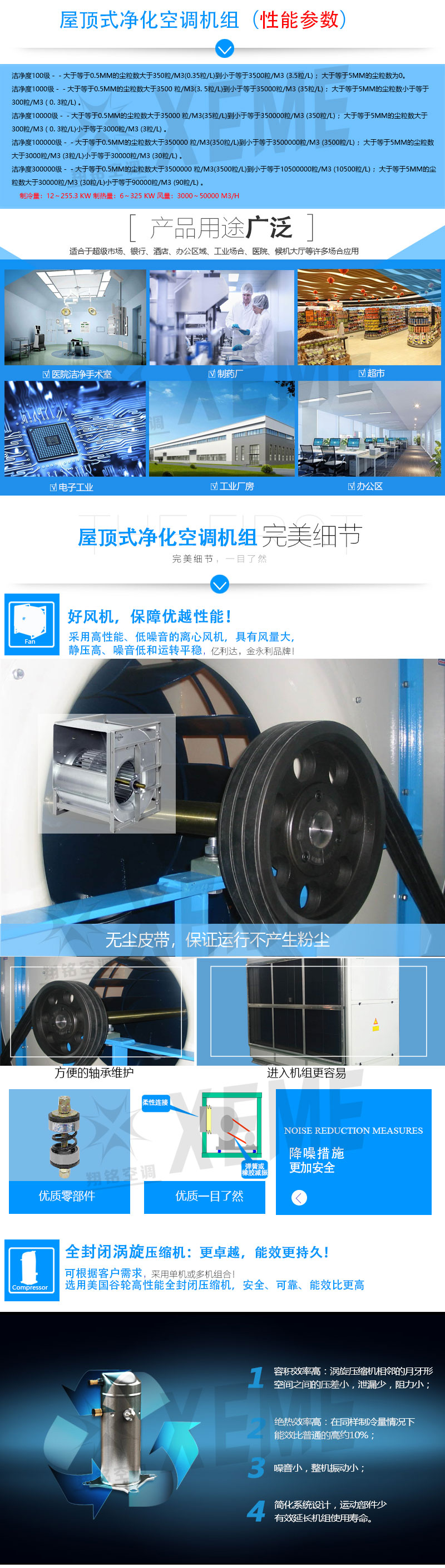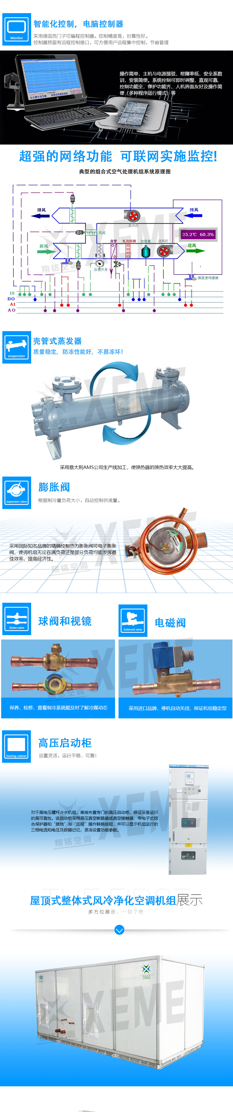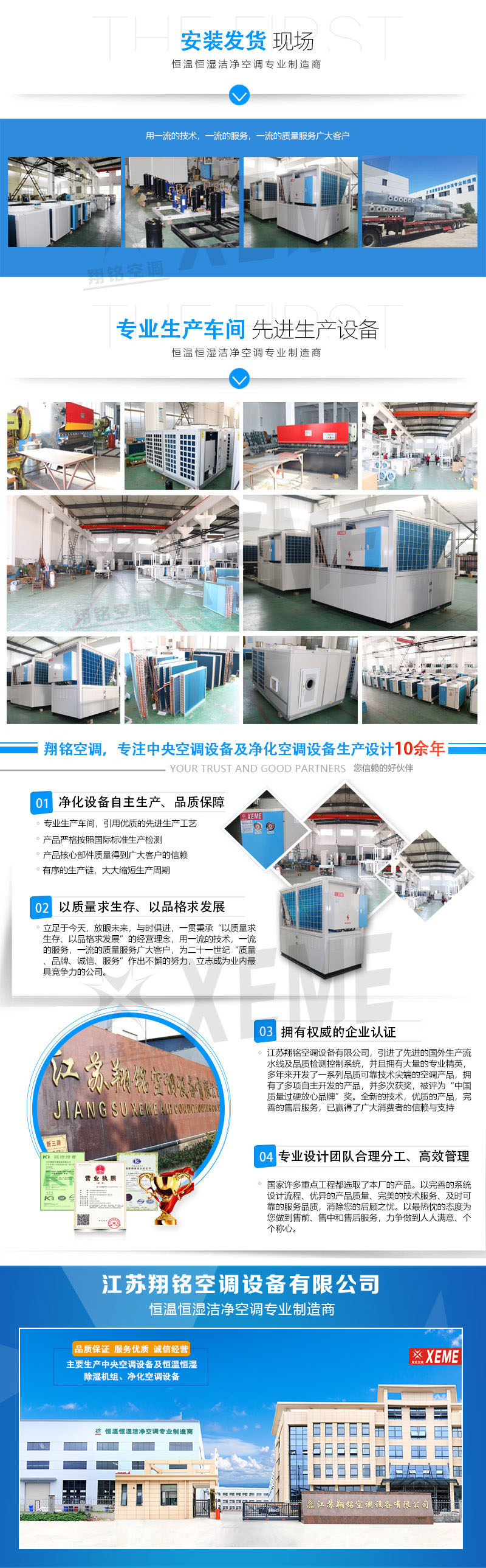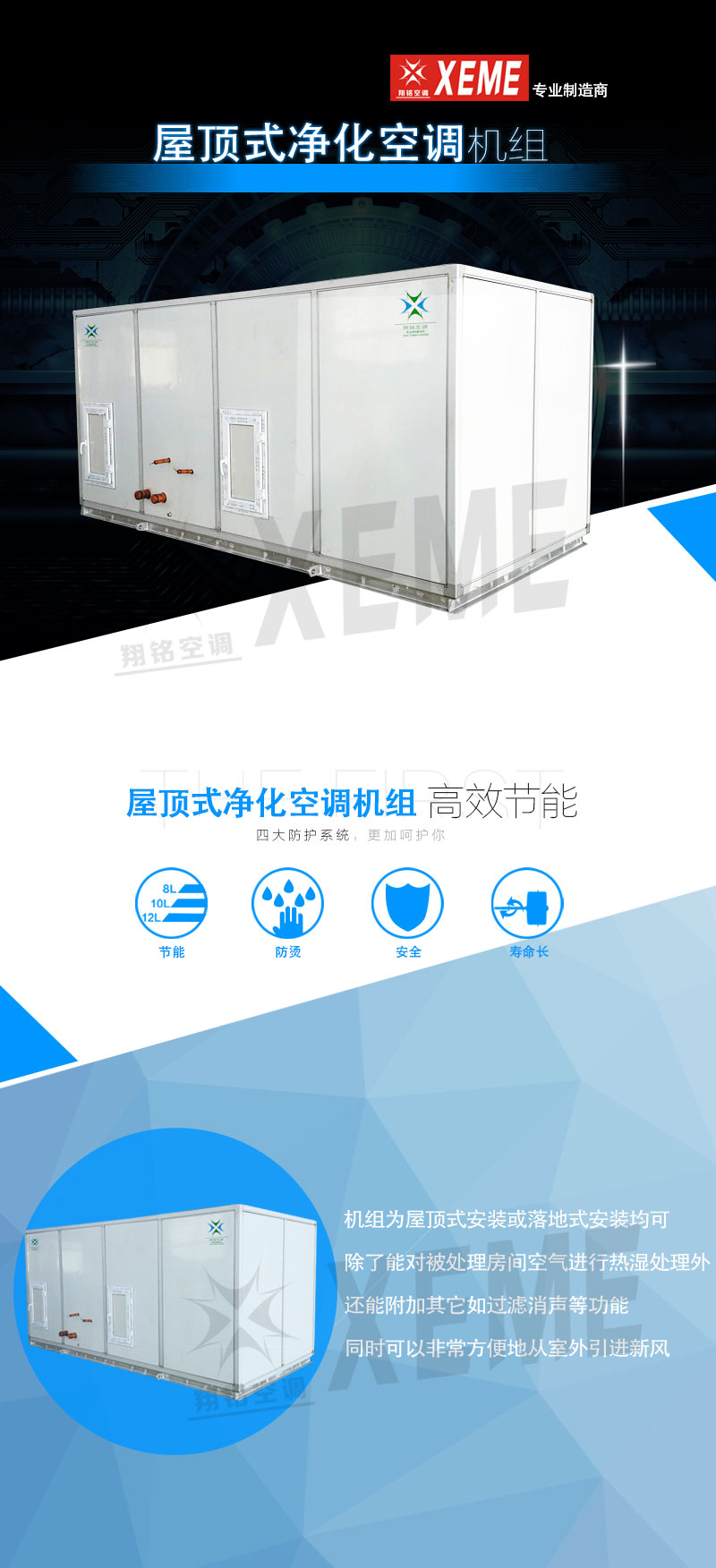 江蘇翔銘空調設備有限公司——屋頂空調機組特別適合于超級市場、銀行、酒店、辦公區域、工業場合、醫院、候機大廳等許多場合應用,機組為屋頂式安裝或落地式安裝均可,除了能對被處理房間空氣進行熱濕處理外,還能附加其它如過濾消聲等功能,同時可以非常方便地從室外引進新風