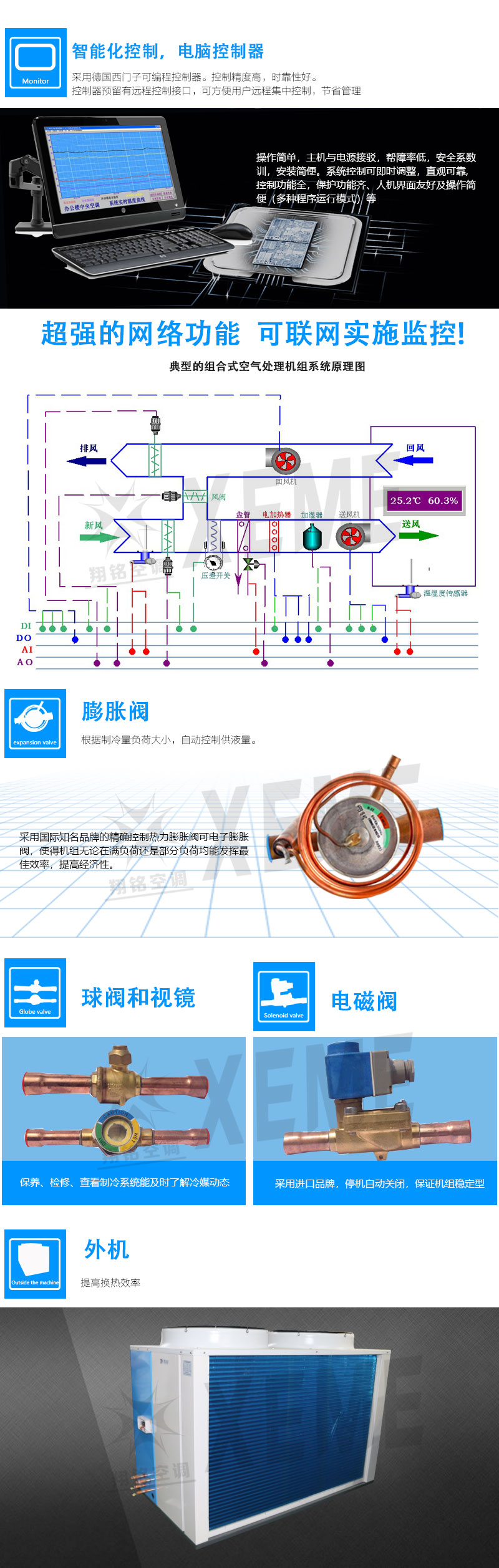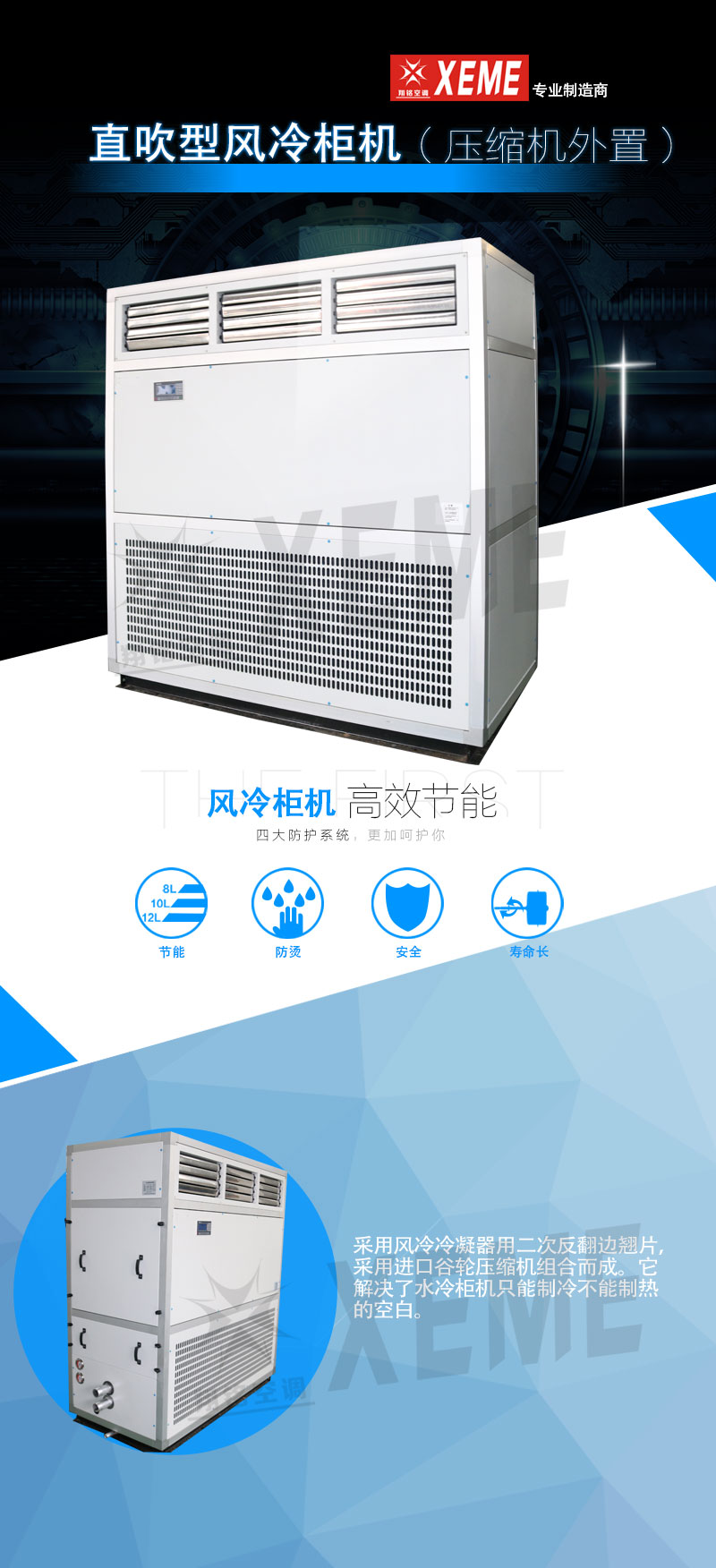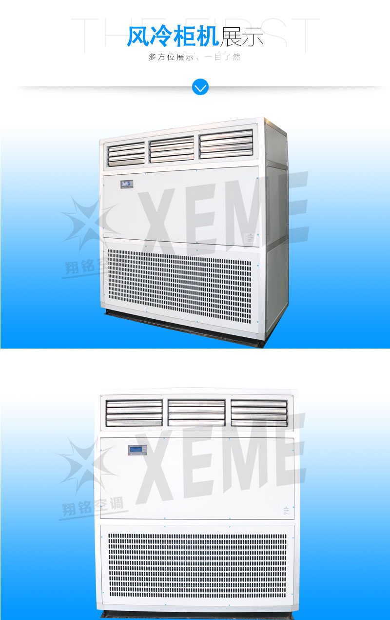 采用風冷冷凝器用二次反翻邊翹片,采用進口谷輪壓縮機組合而成。它解決了水冷柜機只能制冷不能制熱的空白。